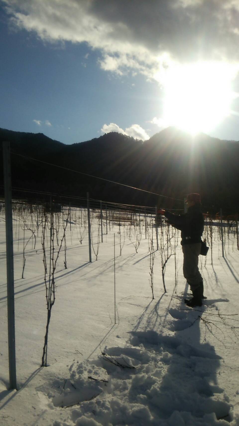 今年の高山村は昨年同様、例年にはない雪の少なさで、時には春のような陽気の日もあり標高の低いところでは積雪もほぼない状態です。標高800m付近にある福井原のHikaru Farmの畑も、例年は50~80センチほどの積雪が、現在は15センチほどに留まっています。今は、剪定作業中ですが、雪の少なさで作業は捗り、順調に推移しています。