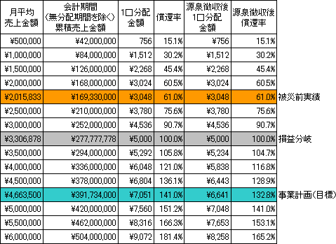 本匿名組合契約における分配金額のシミュレーションは以下のとおりです。なお、シミュレーションの目的は、本匿名組合事業の売上に応じた分配金額を予想することにあります。したがって、売上を保証するものではなく、匿名組合員に対し、分配金額を保証するものでもありません。