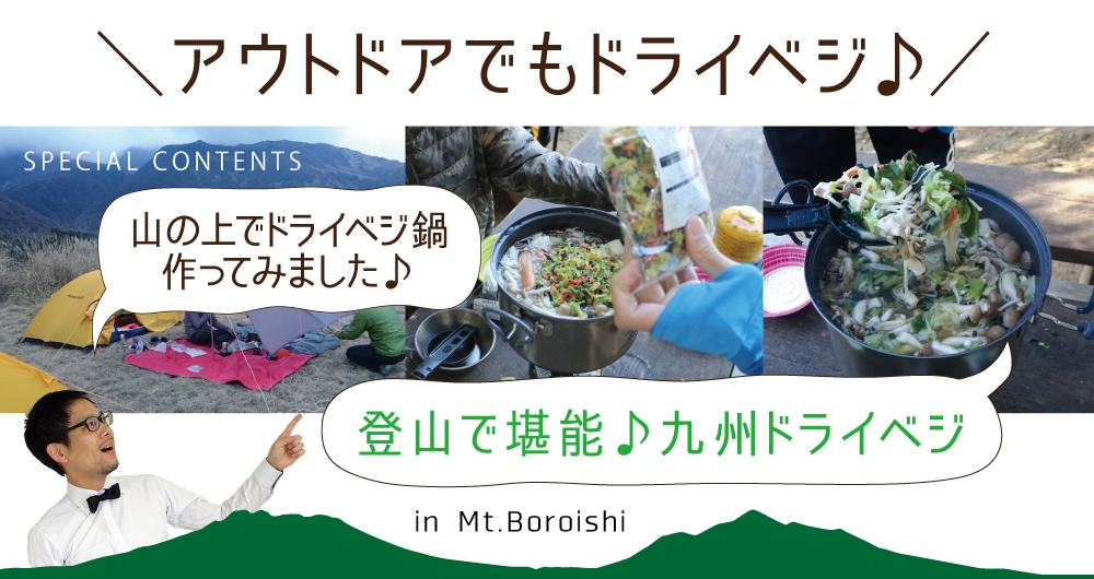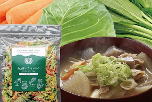 「九州ドライべジ」は、大手インターネット通販サイトを中心に年間販売10,000袋という実績を誇る人気商品です。野菜の産地は九州にこだわり、人参、小松菜、キャベツに加えて、大変希少な九州産ワカメをふんだんに使用しています。また、乾燥加工については、流行りのフリーズドライ製法をあえて選択せず、生産効率は落ちますが、安心安全な野菜の栄養や風味、食感を活かせるエアーズドライ製法を採用して低温でじっくりと時間をかけて行っています。「九州ドライベジ」は、日常で野菜不足になりがちな方や野菜を使いきれない方、アウトドアなどの外出先で手軽に野菜を採りたい方などへ、美味しく、安心して食べられるとご好評頂いています。