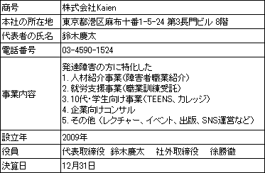 ![]() >>Kaienの就労支援事業について >>2012年7月16日 第4回 Small but Big >>2012年7月15日 第3回 発達障害者の力を生かしてお金を稼ぐ >>2012年7月14日 第2回 職業訓練修了生の8割が就職 定着率も9割以上 >>2012年7月13日 第1回 発達障害者と就職 |