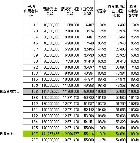 (注1)シミュレーションの目的は、本匿名組合事業の売上に応じた分配金額を予想することにあります。したがって、売上高を保証するものでもなければ、匿名組合員に対し、分配金額を保証するものでもありません。
