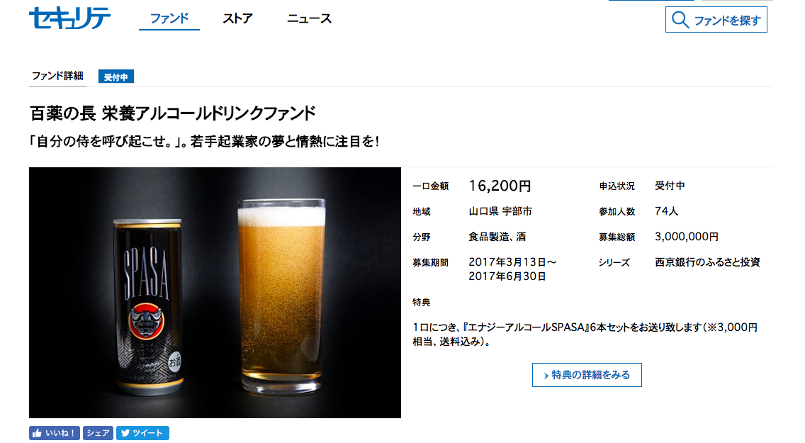 | 募集受付期間 | 2017年3月13日〜2017年6月30日 ※この期間中であっても、出資金額が出資募集最大総額に達した 場合は、そのときをもちまして出資の募集を終了します。 |