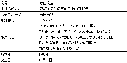 | ■沿革 1975年 御伊勢浜海水浴場にて、海の家かもめ食堂の運営事業を開始。 1985年 自宅にて、藤田商店の商号でお土産ものの販売事業を開始。 1986年 「ウニ・ホヤ」の加工事業を開始。 1987年 「ウニ」を中心とした宅配サービスによる販売事業を開始。 1990年 販売商品に御中元及び御歳暮用のセット商品を加えて、宅配サービスによる販売事業を拡大。 1991年 観光客向けに地引網の体験等の企画・運営事業を開始。 2000年 営業者ホームページを開設。 2001年 インターネット販売事業を開始。 ウェブサイト:http://www.fujita-uminosachi.com/ |