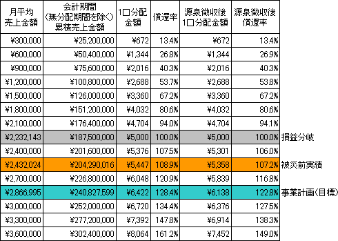 本匿名組合契約における分配金額のシミュレーションは以下のとおりです。なお、シミュレーションの目的は、本匿名組合事業の売上に応じた分配金額を予想することにあります。したがって、売上を保証するものではなく、匿名組合員に対し、分配金額を保証するものでもありません。