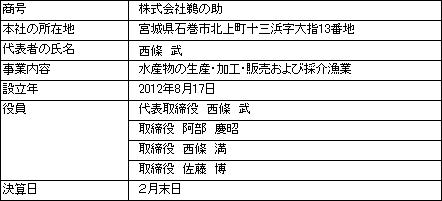 | 株式会社鵜の助は、震災後、石巻市十三浜でそれまで単独で漁業を営んでいた漁師4人(西條武、西條満、阿部慶昭および佐藤博)が集結し、共同作業による負担の軽減、作業効率の向上、コストの削減を目標として立ち上げた会社です。例えば、時化(しけ)に強い養殖施設や漁具の提案など、4人のこだわりをいいとこ取りした養殖業を行ないます。また、販売面でも、4人それぞれのお客様や販路についてのノウハウを持ち寄り、事業の拡大を目指します。 自分達で納得のいく物しかつくらないこと」に徹し、安心、安全な商品をお客様に提供いたします。 北上川から注がれる栄養豊富な山のミネラルと、外洋の荒波。世界に誇る三陸の漁場の中でも、特に恵まれた地形の十三浜から、私たち漁師が育てた海の幸を皆さまの食卓へ、直接届けてまいります。 |