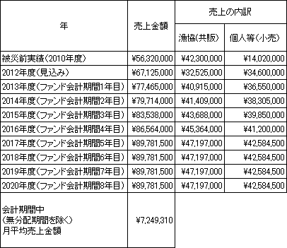 | 被災前概算の 平均月売上金額 | 0円(税込) (注) 営業者は、震災後に新規に設立されたため、被災前の売上金額はありません。なお、営業者を設立してその事業を行う漁師4人が、被災前にそれぞれ個人で営んでいた同種の事業による各売上金額を基に算出される被災前の推定平均月売上金額(税込)は、4,693,333円です。 | |||