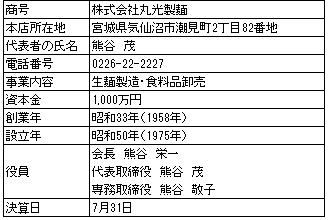 ほぼ日刊イトイ新聞「東北の仕事論。続気仙沼・丸光食品篇」 をみる| 丸光食品の生麺工場は、気仙沼で唯一の製麺工場です。昔ながらのそば・うどん・焼そばは地元の人が慣れしたんだ味で、海鮮ふかひれ生ラーメンは、贈答用などで全国的に人気の商品となっています。また、機械製法だけに頼らず、職人の技で麺を作っています。 昭和33年に「丸光製麺工場」が、麺類の製造をスタート。昭和50年に「丸光食品株式会社」に変更し、地元スーパー・小売店及び食堂等に麺類を供給 創業五十年を迎えた今も、『こだわり』をもち続け、ナンバーワン商品ではなく、オンリーワン商品を通した麺食文化への貢献を目指します 「気仙沼 海鮮ふかひれ生ラーメン」が、第11回みやぎものづくり大賞の優秀賞受賞 ※こちらのリンクから商品説明がご覧いただけます。 |