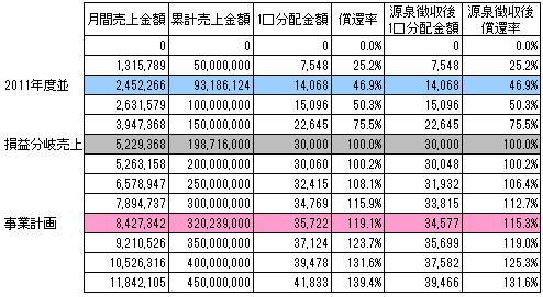 本匿名組合契約における金銭による分配金額のシミュレーションは以下のとおりです。なお、シミュレーションの目的は、本匿名組合事業の売上に応じた分配金額を予想することにあります。したがって、売上を保証するものではなく、匿名組合員に対し、分配金額を保証するものでもありません。