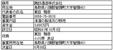![]() | プロフィール | 鳥取・因幡の銘酒“諏訪泉”の所在地は鳥取県智頭町。中国山地の山々に囲まれた岡山県との県境の町、鳥取砂丘へ砂を運んだ千代川(せんだいがわ)の源流近くに位置する宿場町にある蔵です。 蔵の創業は安政9年(1859年)、地元の水、人、米、風土に恵まれ、地元に根ざした造りを心がけております。酒銘の「諏訪泉」は、蔵の裏手の諏訪神社(信州諏訪大社の分霊を祭っています)から戴いており、7年に一度、御柱祭りがとりおこなわれます。 「天のない酒造り」、現在相談役(前杜氏)の言葉ですが酒造りには天(最高)がないこと、言い換えると終りがないことを示し、日々努力であるという言葉です。酒作りに係わる諏訪酒造社員全員の思いでもあります。酒を造り、お客様に安らぎと満足をお届けすることにより、田んぼを守り、酒造りの伝統を守り、地域社会の一員として貢献し、蔵が存続すること、地域になくてはならない酒蔵を目指してがんばっていきたいと思います。 諏訪酒造の近年のテーマは「幸せな食卓」です。家族、夫婦、友達で食卓を囲むことは、会話を交わすこと、時間を共有すること。幸せな食卓作りに日本酒が出来ることを考えて行きたいと思います。美味しいお料理に美味しい日本酒を提案していきます。諏訪泉のお酒は「幸せな食卓」作りを支援します。 蔵詳細紹介はこちら |