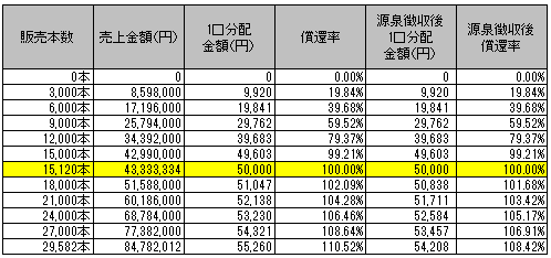 (注2) 表中の償還率は、次の算出式によって計算される全会計期間に係る1口あたり分配金額の合計額を基にした償還率であって、年率ではありません。1口50,000円の出資金に対し、1口分配金額が50,000円となる時点を償還率100%としています。