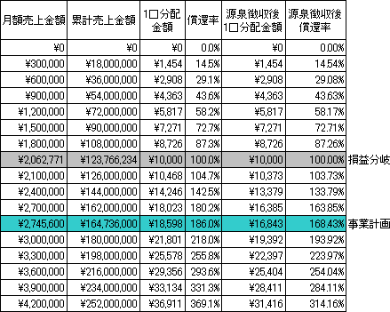 本匿名組合契約における金銭による分配金額のシミュレーションは以下のとおりです。なお、シミュレーションの目的は、本匿名組合事業の売上に応じた分配金額を予想することにあります。したがって、売上を保証するものではなく、匿名組合員に対し、分配金額を保証するものでもありません。