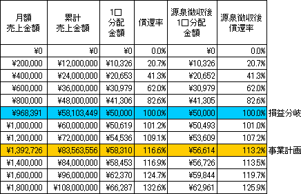 | 取扱者の報酬 | 取扱手数料:出資金の5.5% 運営手数料:出資金の1.05%/年 成功報酬:(売上金額-予想リクープ累計売上金額)×1%) | |||