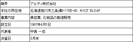 ![]() | プロフィール 代表取締役 中西一也氏 北海道旭川市生まれ。旭川理容美容専門学校卒業。27歳にて独立。1999年アルティをオープン。 2006年ハーブギャラリーをオープン。仕入れたハーブを販売する。2009年に自社化粧品を使用したエステをオープン、化粧品、シャンプーを販売。「dupa(デューパ)」の副理事長(現職) |