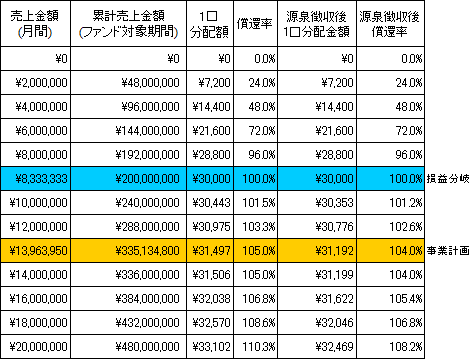 本匿名組合契約における金銭による分配金額のシミュレーションは以下のとおりです。なお、シミュレーションの目的は、本匿名組合事業の売上に応じた分配金額を予想することにあります。したがって、売上を保証するものではなく、匿名組合員に対し、分配金額を保証するものでもありません。