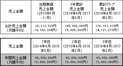 営業者の当期(2013年6月~11月)の6ヶ月売上金額は28,213,825円であり、事業計画上の本匿名組合契約会計期間(2014年度~2016年度)の累計売上金額は180,000,000円(年平均売上金額60,000,000円)となっております。本匿名組合における累計リクープ売上金額は170,181,818円(年平均売上金額56,727,273円)となっております。