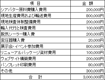 これまでは、シアバターの販売を中心に行い、シアバターでは年間400万円に近い売上をあげています。これからは、シアバター石鹸の新シリーズの販売開始に合わせ、新たにファンド資金で実施する展示会やイベント、通信売サイトの強化、価格を抑えた新商品の販売により販売量を拡大することで、4年目にシアバター石鹸の年間売上目標750万円の実現を図ります。