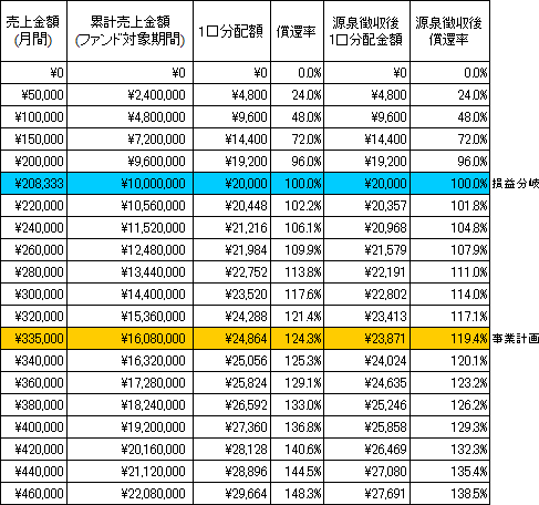 事業計画上の本匿名組合契約会計期間(2014年4月~2018年3月)の累計売上高は16,080千円(月平均売上金額335千円)であり、本匿名組合における累計リクープ売上高は10,000千円(月平均売上金額208千円)です。なお、営業者の前期(2012年9月~2013年8月)の売上金額は400千円です。
