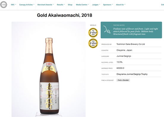 IWC2019 赤磐雄町ゴールド」がGOLDメダルの中から選ばれる、トロフィーを受賞
