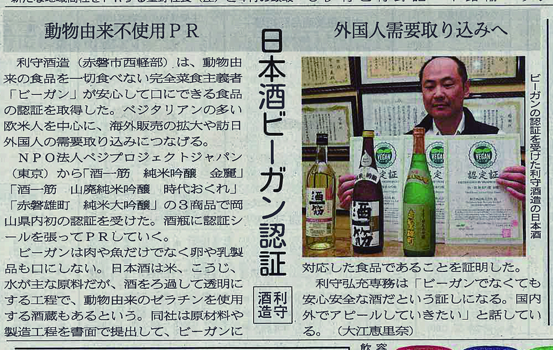 ヴィーガン認証の記事が山陽新聞に掲載されました