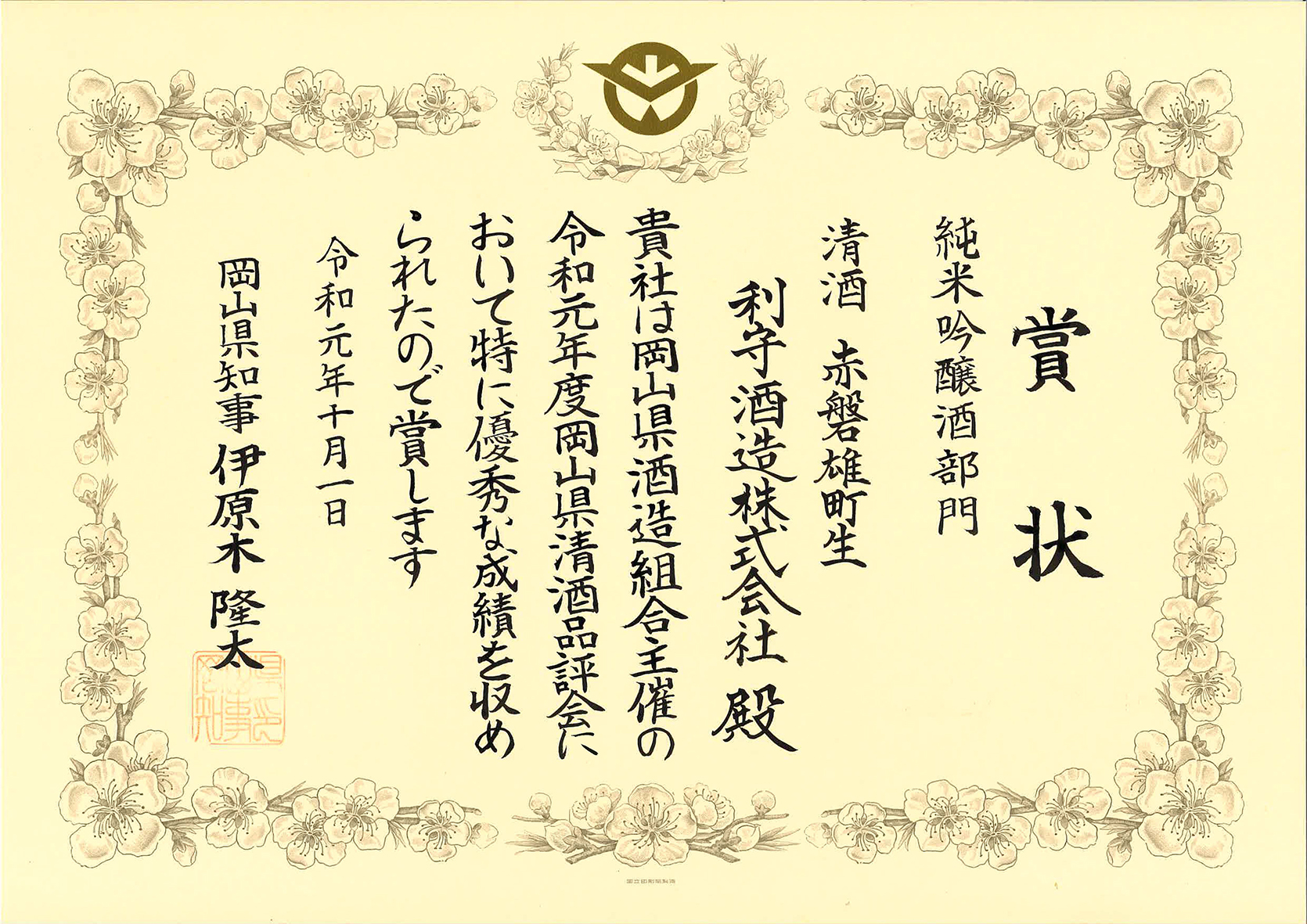 岡山県清酒鑑評会・岡山県知事賞受賞