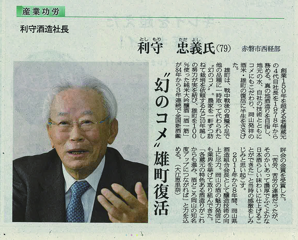 弊社社長・利守忠義(4代目)が「雄町米」復活の功績により産業功労部門で受賞致しました。