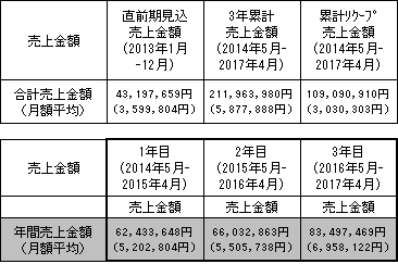 事業計画上の本匿名組合契約会計期間(2014年5月~2017年4月)の累計売上金額は211,963,980円(年平均売上金額70,654,656円)であり、本匿名組合における累計リクープ売上金額は109,090,910円(年平均売上金額36,363,636円)です。なお、営業者の直前期(2013年1月~2013年12月)の売上金額見込額は43,197,659円です。