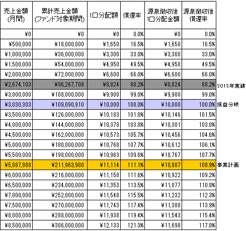 本匿名組合契約における金銭による分配金額のシミュレーションは以下のとおりです。なお、シミュレーションの目的は、本匿名組合事業の売上に応じた分配金額を予想することにあります。したがって、売上を保証するものではなく、匿名組合員に対し、分配金額を保証するものでもありません。