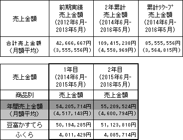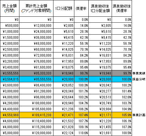 営業者の前期(2012年度)売上金額は42,666,667円(月平均売上金額3,555,556円)であり、事業計画上の本匿名組合契約会計期間(2014年度~2015年度)の累計売上金額は109,415,238円(月平均売上金額4,558,969円)となっております。本匿名組合における累計リクープ売上金額は85,555,556円(月平均売上金額3,564,815円)となっております。