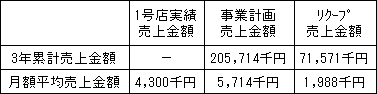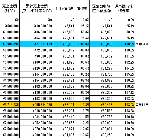 本匿名組合事業の事業計画上の本匿名組合契約会計期間3年間(2014年度~2016年度)の累計売上金額(税抜)は205,714千円(月平均5,714千円)となっております。本匿名組合契約における3年間累計リクープ売上金額(税抜)は71,571千円(月平均1,988千円)です。なお、「とろさば料理専門店 SABAR(サバー)」大阪第1号店の既存売上金額(税抜き)は月平均4,300千円程度です。