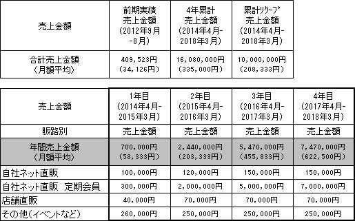 事業計画上の本匿名組合契約会計期間(2014年4月~2018年3月)の累計売上高は16,080千円(月平均売上金額335千円)であり、本匿名組合における累計リクープ売上高は10,000千円(月平均売上金額208千円)です。なお、営業者の前期(2012年9月~2013年8月)の売上金額は409千円です。