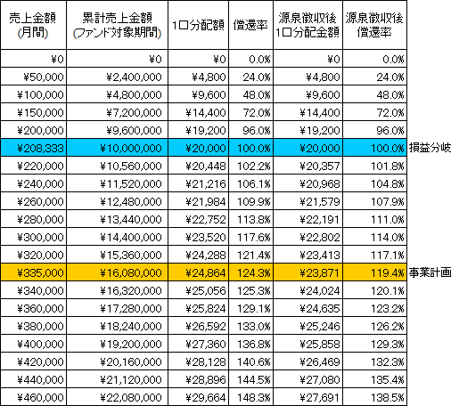 本匿名組合契約における金銭による分配金額のシミュレーションは以下のとおりです。なお、シミュレーションの目的は、本匿名組合事業の売上に応じた分配金額を予想することにあります。したがって、売上を保証するものではなく、匿名組合員に対し、分配金額を保証するものでもありません。