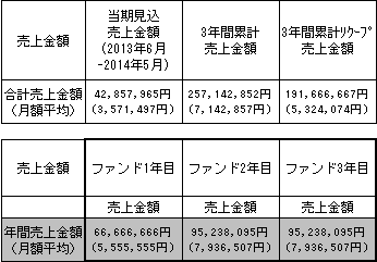 事業計画上の本匿名組合契約会計期間の3年間累計売上金額(税抜)は257,142,852円(月平均7,142,857円)であり、本匿名組合契約における累計リクープ売上金額(税抜)は191,666,667円(月平均5,324,074円)です。なお、営業者の前期(創業初年度、2012年7月~2013年5月)の売上金額(税抜)は9,503,197円、当期(2013年6月~2014年2月)の売上実績金額(税抜)は32,153,203円、直近月(2014年2月)の売上実績金額(税抜)は5,618,742円です。