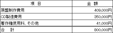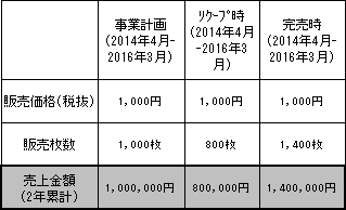 事業計画上の本匿名組合契約会計期間(2014年4月~2016年3月)の累計売上金額(税抜)は1,000,000円(CD販売枚数1,000枚)であり、本匿名組合における累計リクープ売上金額(税抜)は800,000円(CD販売枚数800枚)です。