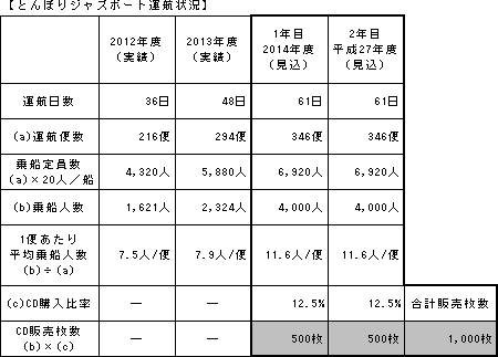なお、平成26年度における運行予定日数は61日間で、運行予定便数は346便、乗船総定員は6,920名(定員20人×346便)で、事業計画上の乗船者数は4,000人(11.6人×346便)です。また、過去2年間の乗船客数は、平成24年度が約1,621人(運航日36日、運行便数216便、1便あたり7.5人)、平成25年度が2,324人(運行日48日、運行便数294便、1便あたり7.9人)です。
