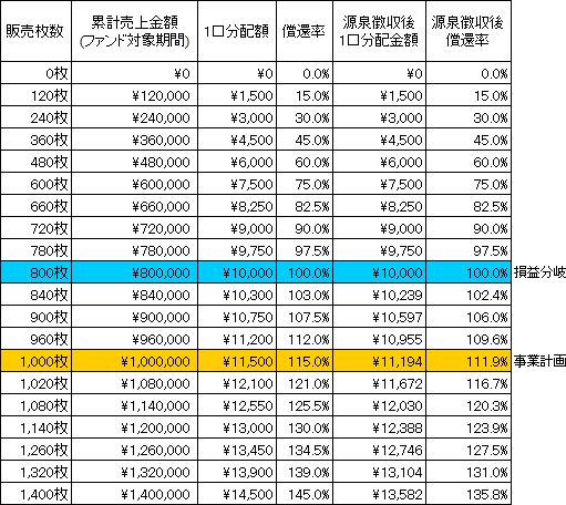 本匿名組合契約における金銭による分配金額のシミュレーションは以下のとおりです。なお、シミュレーションの目的は、本匿名組合事業の売上に応じた分配金額を予想することにあります。したがって、売上を保証するものではなく、匿名組合員に対し、分配金額を保証するものでもありません。