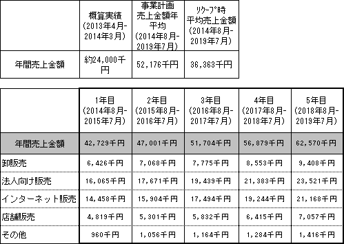 事業計画上の本匿名組合契約会計期間(2014年8月~2019年7月)の累計売上金額(税抜)は260,883千円(年平均売上金額52,176千円)であり、本匿名組合における累計リクープ売上金額(税抜)は181,818千円(年平均売上金額36,363千円)です。なお、営業者の法人設立前(個人事業主)における直前1年間(2013年4月~2014年3月)の概算売上金額(税抜)は約24,000千円です。