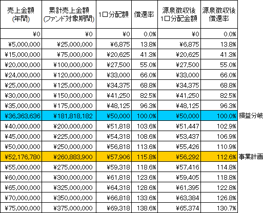 本匿名組合契約における金銭による分配金額のシミュレーションは以下のとおりです。なお、シミュレーションの目的は、本匿名組合事業の売上に応じた分配金額を予想することにあります。したがって、売上を保証するものではなく、匿名組合員に対し、分配金額を保証するものでもありません。