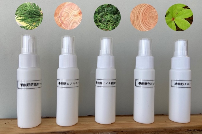 熊野芝原杉、熊野ヒノキ、熊野ヒノキ枝葉、熊野色川ヒノキ、熊野クロモジの5種セット