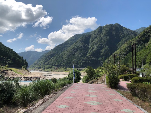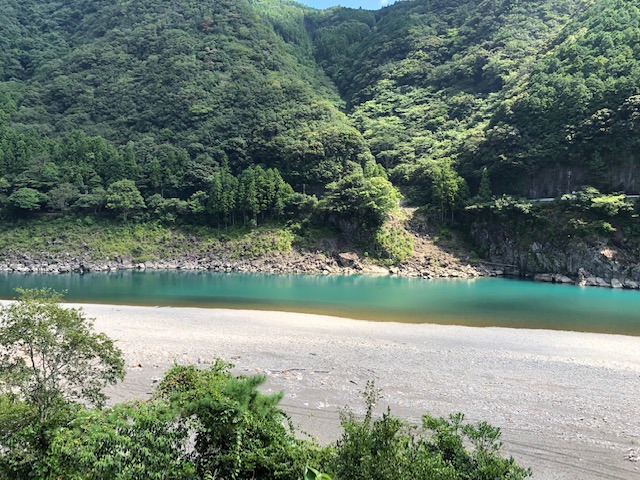 (普段は静かに流れる世界遺産である熊野川。向こう岸の道路より下はきれいな緑でしたが、