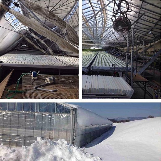 大雪により倒壊、破損した設備については、修復又は代替設備を購入します。なお、購入費用の90%以上は県や国から給付される補助金や保険金により賄え、被災前の設備に復旧する目処が付いております。