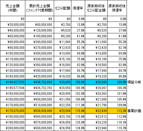 本匿名組合契約における金銭による分配金額のシミュレーションは以下のとおりです。なお、シミュレーションの目的は、本匿名組合事業の売上に応じた分配金額を予想することにあります。したがって、売上を保証するものではなく、匿名組合員に対し、分配金額を保証するものでもありません。