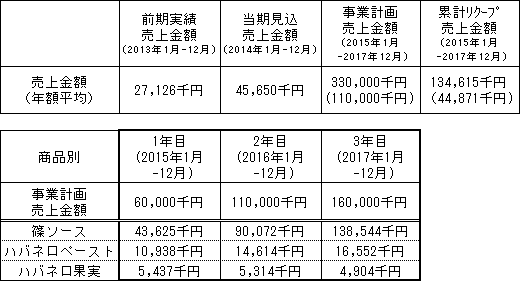 前期で主力の(ハバネロ)篠ソースを約2万本販売しており、販売先からの評価も高く、毎年、受注量が増えており、今期は8-10万本の販売が見込まれています。今後、篠ソースの認知度の向上とともに既存の販売ルートである日本全国で展開している大手量販店、大手スーパーでの取扱量が増加することが見込まれ、また、現在も増え続けている新規の得意先への販売を行うことで事業計画を達成することを見込んでいます。