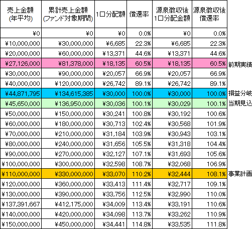 本匿名組合契約における金銭による分配金額のシミュレーションは以下のとおりです。なお、シミュレーションの目的は、本匿名組合事業の売上に応じた分配金額を予想することにあります。したがって、売上を保証するものではなく、匿名組合員に対し、分配金額を保証するものでもありません。