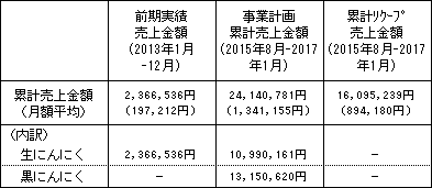 事業計画上の本匿名組合契約会計期間(2014年9月~2017年1月)の累計売上金額(税抜)は24,140,781円です。なお、本匿名組合事業で生産するにんにくは2015年7月頃に収穫予定であり、販売は2015年8月頃となるため、実質的な販売期間は18ヶ月(2015年8月~2017年1月)を想定しております。したがいまして、事業計画上の月平均売上金額(税抜)は1,341,155円です。本匿名組合契約における累計リクープ売上金額(税抜)は16,095,239円(月平均894,180円)です。なお、営業者の前期(2013年1月~2013年12月)の本匿名組合事業に係る売上金額(税抜)は2,366,536円(月平均197,212円)です。