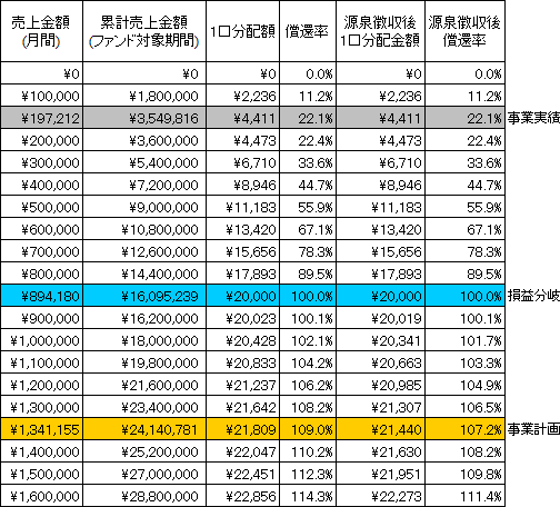 本匿名組合契約における金銭による分配金額のシミュレーションは以下のとおりです。なお、シミュレーションの目的は、本匿名組合事業の売上に応じた分配金額を予想することにあります。したがって、売上を保証するものではなく、匿名組合員に対し、分配金額を保証するものでもありません。