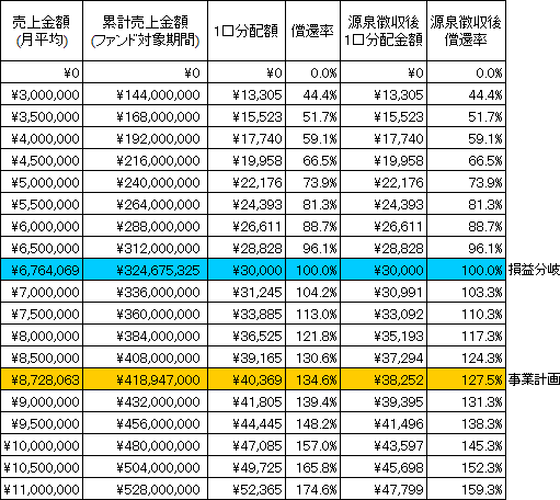 本匿名組合契約における金銭による分配金額のシミュレーションは以下のとおりです。なお、シミュレーションの目的は、本匿名組合事業の売上に応じた分配金額を予想することにあります。したがって、売上を保証するものではなく、匿名組合員に対し、分配金額を保証するものでもありません。