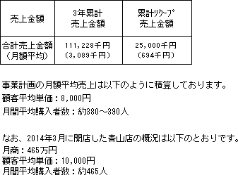 事業計画の達成のためには、顧客を確保し、商品を販売することが必要になります。営業者は、京都店開店に先立ち、広告を行うことで、認知度を高めていくことを計画しております。広告方法としては、オープン前のレセプションパーティの開催、雑誌での広告掲載、看板広告の利用、WEBを使っての告知、既存顧客に対するDMを利用する予定です。