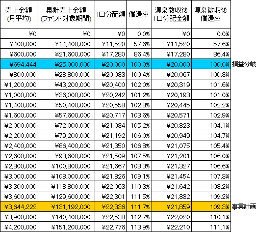事業計画上の本匿名組合契約会計期間(3年間)の累計売上金額(税抜)は131,192千円(年平均売上金額43,730千円)であり、本匿名組合における累計リクープ売上金額(税抜)は25,000千円(年平均売上金額8,333千円)です。