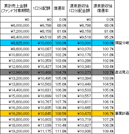 ・リクープ後:リクープ売上金額(税抜)×40%÷353口×1口+(リクープ後売上金額(税抜)-リクープ売上金額(税抜))×4%÷353口×1口