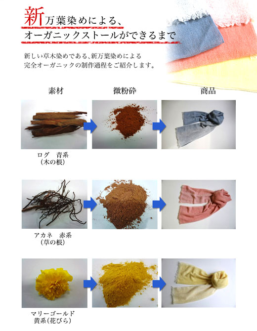 「新万葉染」は、染料を微細に粉砕することなどの新しい技法を用いることで、草木染と同じ天然色素を用いながら、化学合成色素と遜色のない鮮やかな色合いで染色加工ができ、環境に配慮し、肌にも優しい安心・安全な染色法であり、少量で染まり、短時間で染まるため、染色コストが通常の1/10程度で押さえることができます。